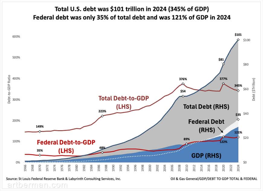 Il debito totale degli Stati Uniti era di 101.000 miliardi di dollari nel 2024 (il 345% del PIL). Il debito federale rappresentava solo il 35% del debito totale e il 121% del PIL nel 2024.Fonte: St. Louis Federal Reserve Bank e Labyrinth Consulting Services, Inc.