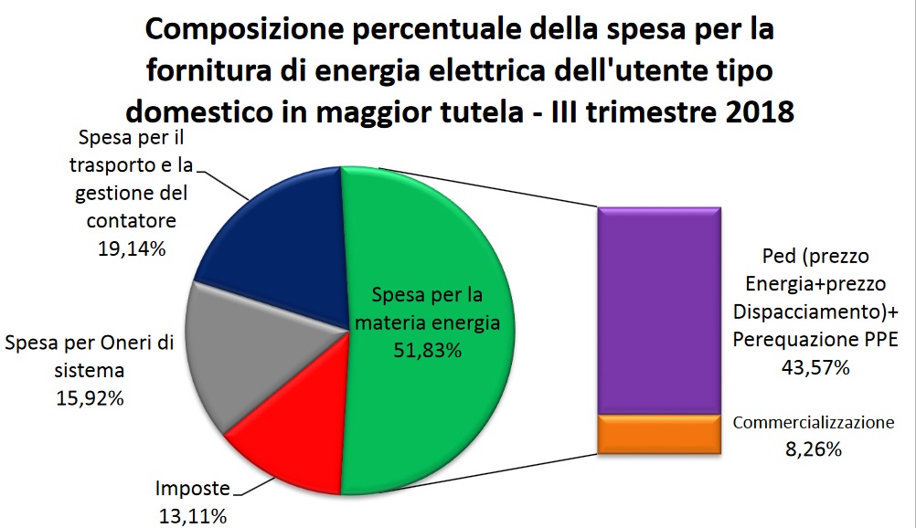 Dubito fortemente che il prezzo della “materia energia” costituisca ben il 50 per cento della bolletta come mostrato nell’immagine, basta un banalissimo calcolo a spanne: l’energia, il cui prezzo e’ fissato dalla borsa elettrica in virtu’ della basilare legge economica della domanda e dell’offerta, e’ visibile a tutti in tempo reale sul sito del gme.it “mercato elettrico”, e non costa quasi nulla, negli ultimi anni ha oscillato fra i 4 e gli 8 centesimi a kwh: significherebbero da 2 a 4 euro per un consumo tipo il mio di 50 kwh mensili, mentre la bolletta tipo che mi arriva e’ da 15, pur in “maggior tutela” che piu’ maggior tutela non si puo’… se e’ una maggior tutela, e’ alla rovescia, qualcosa non quadra.