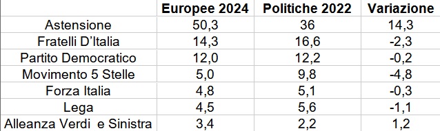 Salta subito all’occhio il netto balzo in avanti di Astensione: se alle consultazioni del 2022 aveva ottenuto la maggioranza relativa, adesso per un soffio sfiora quella assoluta. Tutte le formazioni politiche subiscono il colpo, a partire da quelle afferenti alla maggioranza parlamentare di centro-destra: a rimetterci di più è il partito della premier Giorgia Meloni, che perde il 2,3%. Per quanto riguarda gli alleati, sorpasso ‘in discesa’ di Forza Italia ai danni della Lega, evidentemente Bossi non è l’unico a non aver digerito la deriva intrapresa dal leader Salvini culminata con la candidatura del controverso generale Vannacci.