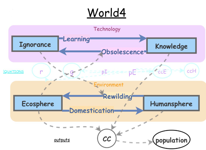 Anziché sui tassi di natalità, l’aspettativa di vita ecc., Word4 è quindi focalizzato sulla disponibilità di risorse e sulla nostra capacità di estrarle. In effetti, vi sono altri due insiemi di fattori critici per il nostro destino: la complessità del sistema socio-economico-tecnologico e la capacità degli ecosistemi di rigenerare le risorse ed evitare l’accumulo di sostanze nocive. A dire il vero quest’ultimo aspetto è indirettamente preso in conto, visto che si utilizza la metodologia dell’ ”Impronta ecologica” e si fa riferimento esplicito a fenomeni come il GW. La complessità è invece parzialmente correlata con la tecnologia che, invece sta al centro del modello.