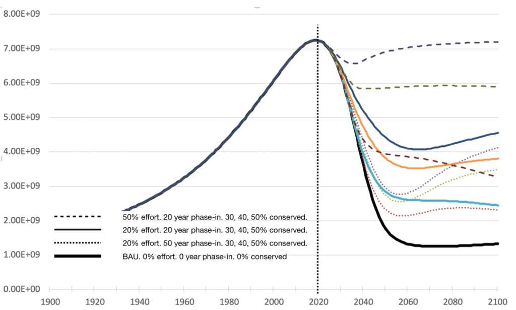 Come al solito, il modello è stato messo a punto facendogli riprodurre i dati reali dei 100 anni scorsi, per poi azzardare delle previsioni sul futuro, inserendo una serie di variabili. Facendo quindi girare il programma un milione di volte, via via inserendo combinazioni di dati diverse, si ottiene un fascio di curve che indicano i possibili sviluppi. Orbene, contrariamente alle proiezioni attualmente accreditate, tutte le curve disegnate puntano decisamente verso il basso a breve termine. La “finestra” che contiene l’80% di probabilità è che il picco della popolazione si verifichi fra il 2025 ed il 2030 intorno ai 7,5 miliardi di persone, per poi giungere al 2060 con una popolazione globale compresa fra 2 e 6,5 miliardi di persone. Come si vede, tutte le curve sottostimano il numero di persone attuali (si ricorda che il modello è settato sui dati fino al 2010) che pare abbia già raggiunto gli 8 miliardi nel 2022 (anche se non è poi certo), ma l’aspetto più interessante è che il margine di incertezza risulta molto ridotto circa l’inizio della flessione, mentre è molto ampio per quanto riguarda la sua rapidità. Tale differenza dipende prevalentemente da differenti ipotesi fatte circa la resilienza degli ecosistemi selvatici; vale a dire dalla loro capacità di continuare a fornire servizi ecosistemici vitali ancorché parzialmente antropizzati.