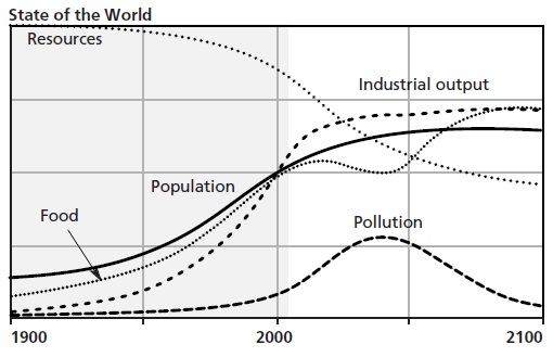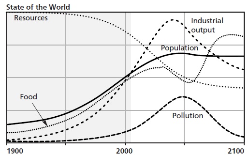 Per spiegare ai lettori il funzionamento del modello informatizzato World3 (artefice delle elaborazioni), gli autori propongono a titolo esemplificativo il cosiddetto ‘scenario 0’ (numero scelto appositamente per far intendere che trattasi di ragionamento per assurdo), dove si assume che le risorse necessarie alla produzione industriale ed il conseguente inquinamento diminuiranno sempre più, che la produttività della terra aumenterà indefinitamente, che lo spazio sottratto all’agricoltura dagli insediamenti abitativi diminuirà progressivamente; tutto ciò in modo rapido e a costi irrisori. Questo mondo sembra ricalcare quello descritto nei manuali di economia neoclassica, non a caso si riesce senza problemi a perseguire il dogma della crescita economica esponenziale: nel 2080 la produzione industriale è trenta volte quella di inizio secolo e non accenna a calare, è stata raggiunta la piena transizione demografica dopo aver toccato il picco di 9 miliardi di abitanti, c’è cibo a volontà, la speranza di vita si è decisamente allungata e l’inquinamento è quasi un ricordo. Che dire: forse ha ragione Kenneth Boulding a pensare che gli economisti siano pazzi, si deve però ammettere che la loro costruzione intellettuale non fa una grinza. Dato a Cesare quel che è di Cesare, lasciamo l’Iperuranio per tornare sulla Terra.