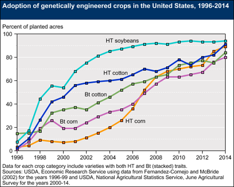 (Le sementi HT sono ‘herbicide tolerant’, cioé resistenti a un particolare tipo di erbicida; quelle Bt sono state modificate per produrre il bacillus thuringiensis, tossina insetticida. Le varietà di mais e cotone ‘stacked’, che presentano contemporaneamente le caratteristiche HT e Bt, stanno gradualmente soppiantando quelle con una sola specifica)
