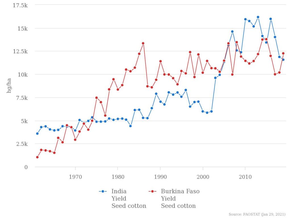 Sorgono dubbi anche riguardo al cotone transgenico, se analizziamo il diverso rendimento in India e Burkina Faso, paesi in cui le varietà Bt sono state introdotte rispettivamente nel 2002 e nel 2008.