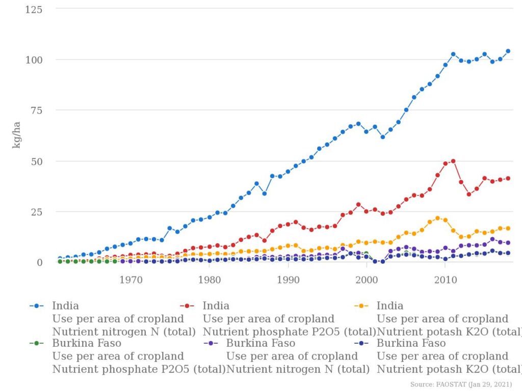 Se nella nazione asiatica si è assistito a una vera e propria escalation produttiva (più volte osannata come prova della bontà della transgenesi), in quella africana non ci sono state variazioni significative rispetto alle rese precedenti, una delle ragioni che ha convinto il Burkina Faso nel 2016 ad abbandonare il cotone Bt della Monsanto (che aveva promesso maggiorazioni anche del 30%). Se esaminiamo il trend dei fertilizzanti per ettaro in entrambi i contesti, vengono alla luce le ragioni di tanta disparità nei risultati.
