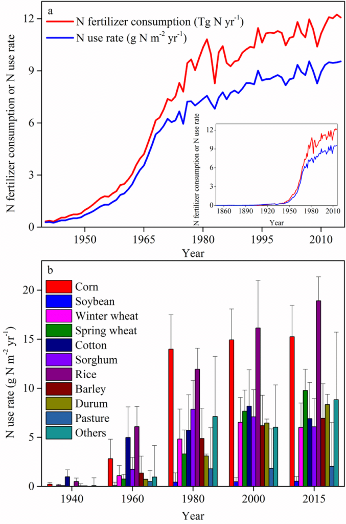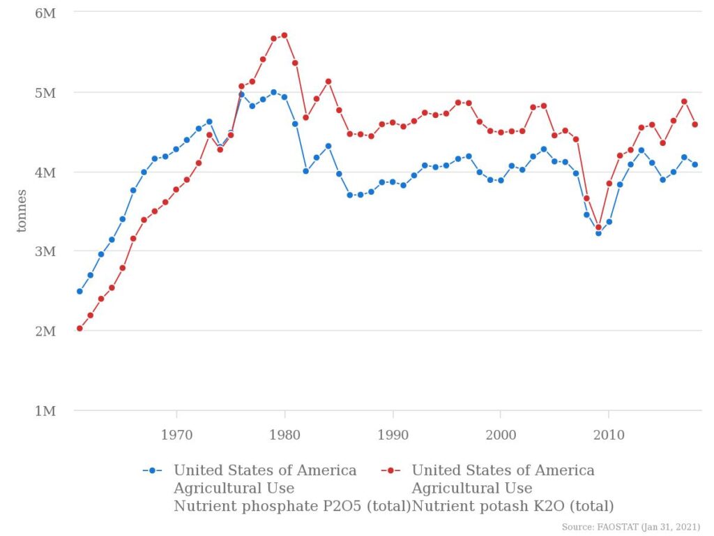 L’esame sull’impiego dei fertilizzanti stronca sul nascere qualsiasi aspirazione di sostenibilità dell’agricoltura USA. Essa ha notevolmente migliorato la propria efficienza a partire dagli anni Ottanta, senza però riuscire a stabilizzare gli stock di risorse non rinnovabili, ma solo il consumo annuale. Almeno per quanto riguarda fosforo e potassio, perché il dispendio di azoto ha solo rallentato la sua crescita, dal momento che i miglioramenti di efficienza nell’impiego per ettaro sembrano aver raggiunto un plateau dall’inizio del nuovo millennio.