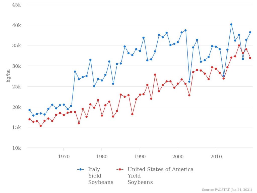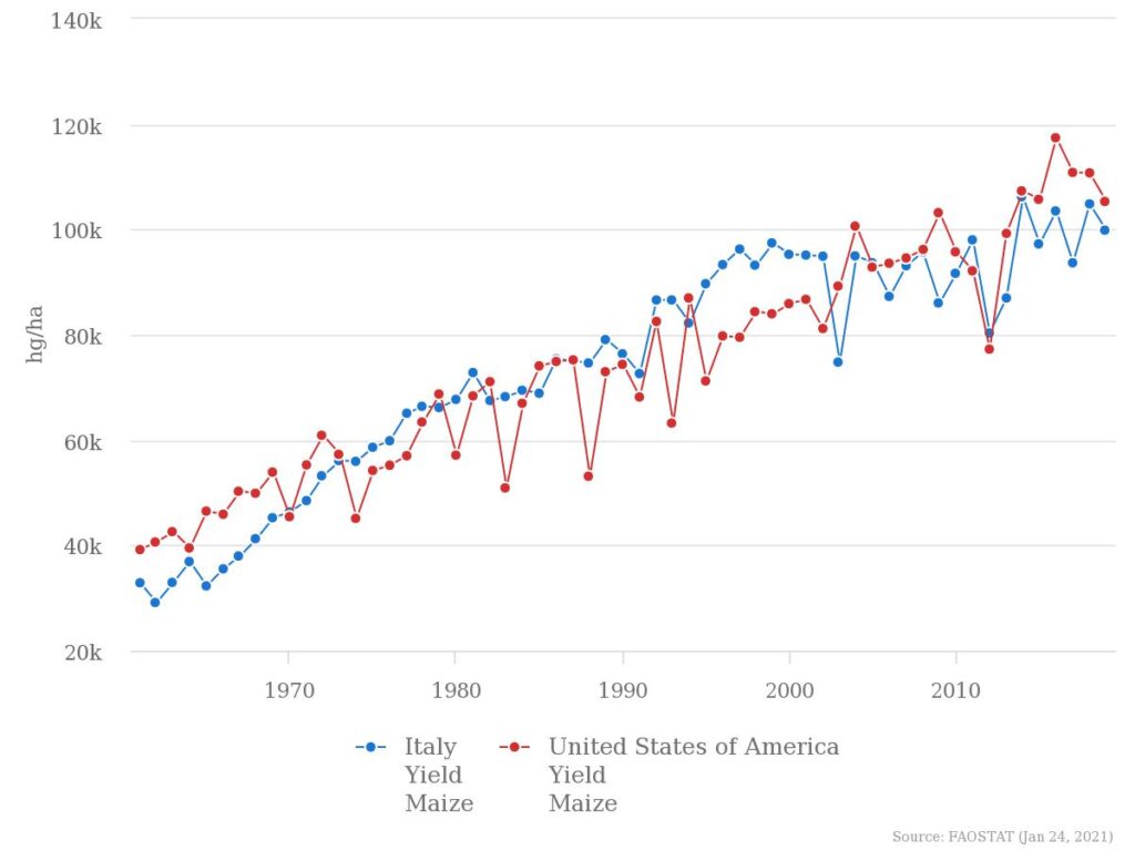 Negli USA è stata indubbiamente riscontrata una crescita lineare delle rese per ettaro di mais, soia e cotone, sebbene in linea con i trend pre-transgenesi. Risultati sicuramente ragguardevoli, che però si scontrano con un’altra evidenza empirica: al di là dei luoghi comuni mediatici (e di situazioni molto particolari come i contest agricoli), le rese dei maiscoltori italiani hanno poco da invidiare a quelle dei colleghi statunitensi, mentre quelle di soia nostrane performano addirittura meglio delle rivali a stelle e strisce.