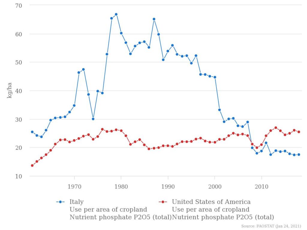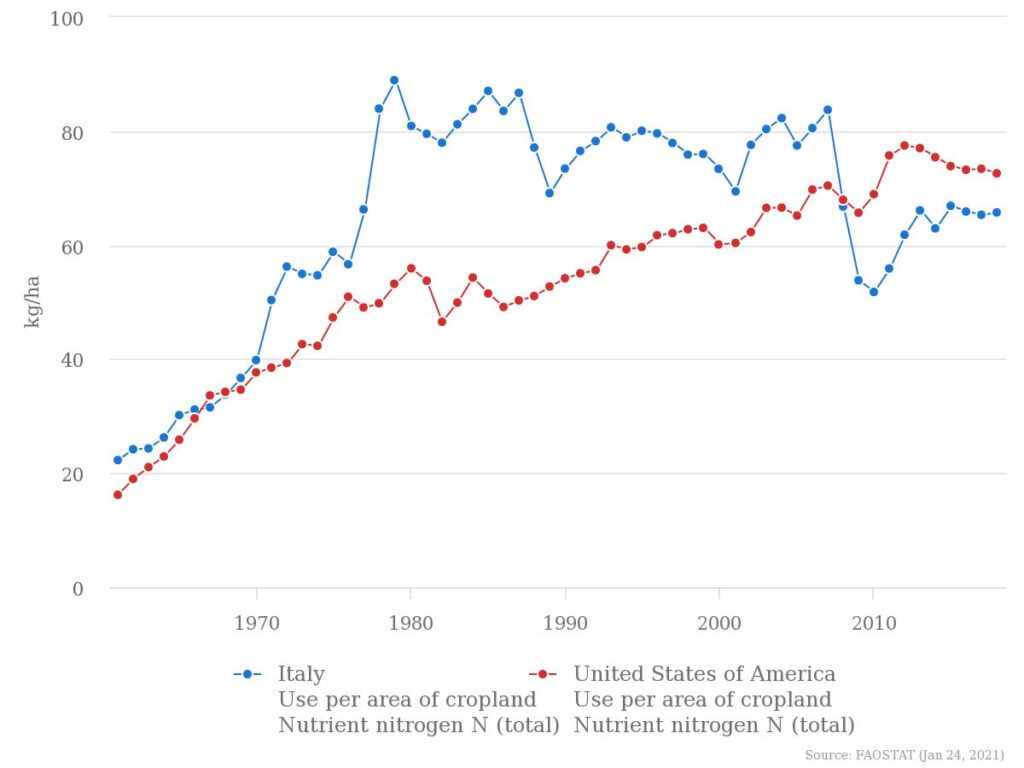 In questa prima disamina dell’agricoltura USA, non solo è stato demitizzata la leggenda popolare sulla maggiore produttività delle sementi OGM, ma si è anche scoperto che, sul versante dei fertilizzanti di sintesi, da una decina d’anni l’agricoltura italiana è addirittura più virtuosa di quella dello zio Sam.