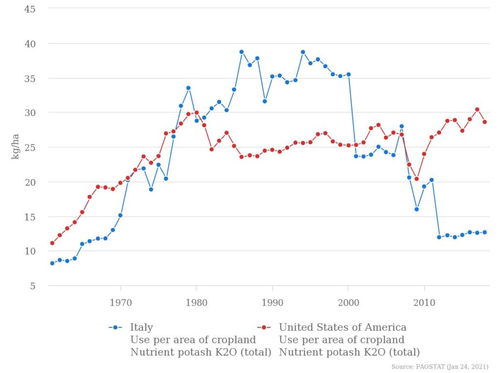 Fatto ancora più importante, l’agricoltura italiana ha intrapreso negli ultimi quindici anni un grosso sforzo per efficientare l’impiego dei nutrienti, al punto che il consumo per ettaro oggi è inferiore a quello USA. Pertanto, i nostri maiscoltori avrebbero dovuto rosicare molto di più negli anni Ottanta, quando le controparti d’oltreoceano riuscivano a ottenere rese pressoché identiche con molta meno concimazione.