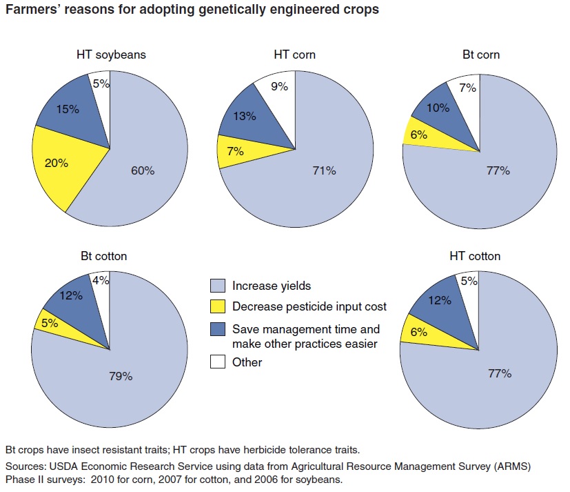 D’altro canto, siccome prima di immettere sul mercato una semente transgenica occorrono mediamente tredici anni e 130 milioni di dollari spesi in ricerca e sviluppo, bisogna chiedersi se un impiego non ‘gonfiato’ ricompenserebbe adeguatamente gli investimenti. In ogni caso, al di là delle esagerazioni promozionali dei loro sostenitori, le sementi transgeniche non sono state progettate per aumentare la resa delle coltivazioni, sebbene sondaggi condotti dall’USDA rivelino che sia stata la ragione principale a spingere gli agricoltori statunitensi a passare agli OGM.