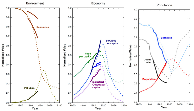 Uno studio del 2008 di Graham Turner ha dimostrato che, rispetto allo scenario base, l’umanità è riuscita a disporre di maggiori risorse naturali, ragion per cui ha potuto sostenere gli sforzi di agricoltura e industria; attribuisco questo merito al mix di indebitamento – sfruttamento – progresso/regresso tecnologico che ha contraddistinto gli ultimi quarant’anni; inoltre, gli ecosistemi hanno dimostrato una capacità di assorbimento degli inquinanti leggermente migliore di quella prospettata.