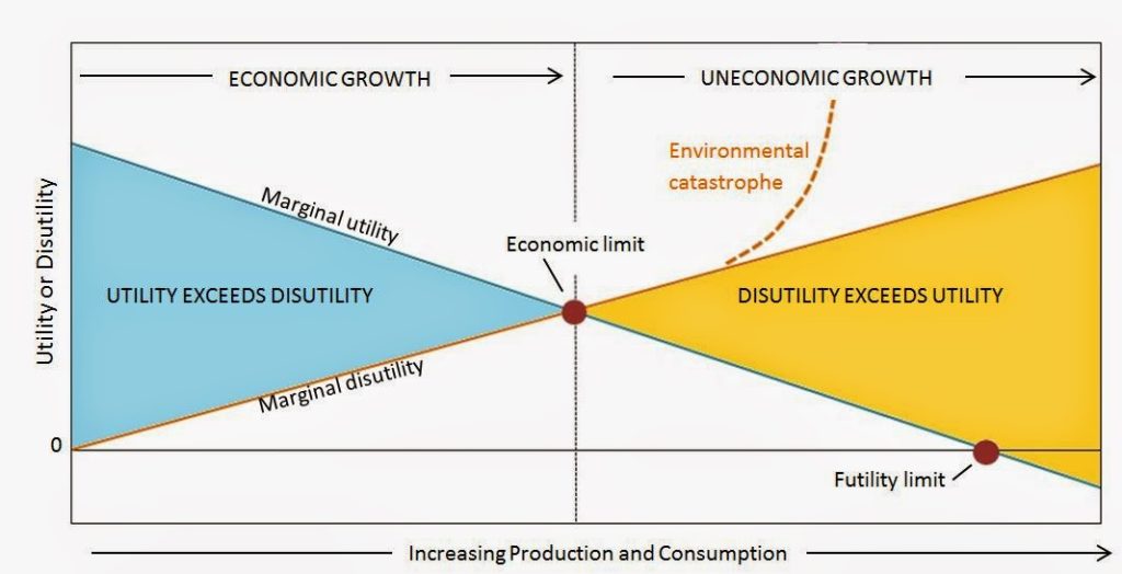 Tuttavia, lo sviluppista può fare spallucce osservando che i principali indicatori di benessere, a livello globale – PIL pro capite, aspettativa di vita, produzione alimentare, lotta alla denutrizione, ecc. – non mostrano flessioni, per cui alla fine tutto si ridurrebbe a una questione puramente ‘estetica’. In effetti, una delle maggiori abilità del BAU è stata quella di combattere le esternalità negative provocate dalla crescita con le risorse generate dalla crescita stessa, un paradossale cane che si morde la coda che per molti versi ha funzionato a dovere ma che, ovviamente, non può proseguire oltre una certa soglia, oltrepassata la quale Herman Daly parla di “crescita anti-economica” (per non dilungarmi troppo, rimando a un ottimo articolo di Jacopo Simonetta sull’argomento). Le elaborazione basate sul Genuine Progress Indicator (indicatore di benessere selettivo alternativo al PIL, elaborato sulle intuizioni di Daly) segnalano che tale limite è stato varcato nei primi anni Settanta, guarda caso proprio quando i progressi sociali postbellici hanno raggiunto il culmine e l’impronta ecologica umana ha superato la biocapacità planetaria.