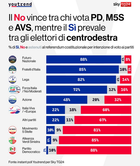 Il confronto può far storcere il naso, essendosi espressi a favore della riforma anche Azione e alcuni esponenti del PD, mentre Italia Viva non aveva dato indicazioni precise in merito. Tuttavia, se la ricerca condotta da YouTrend sulle intenzioni di voto ai partiti rispetto al quesito referendario è corretta, solo una quota minoritaria di voti per il SÌ proviene da elettori non riconducibili alle forze di governo.