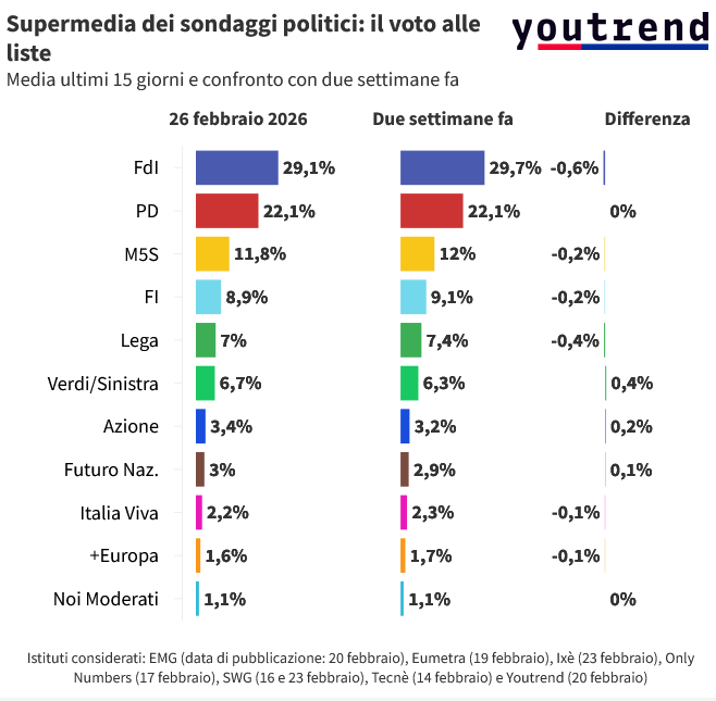 Se il SÌ sembra incarnare abbastanza fedelmente il sostegno al centro-destra, possiamo parimenti associare i 14.4 milioni di elettori che hanno optato per il NO al cosiddetto “campo largo” (PD, AVS e M5S)? Oggettivamente, nulla lascia supporre un recupero di ben cinque milioni di voti rispetto alle Europee. Nemmeno i sondaggi più recenti dei principali istituti demoscopici fanno presagire uno scossone di tale portata.