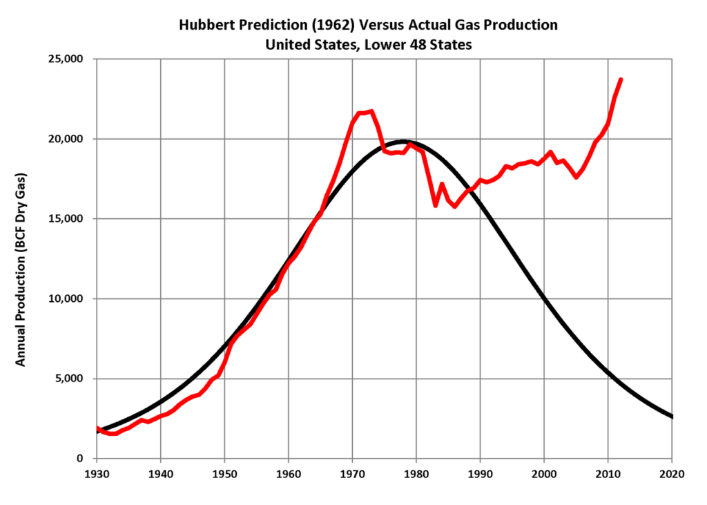 Alla luce delle aspettative degli anni Cinquanta-Sessanta sulle meravigliose sorti progressive dell’atomo, non sorprende lo scarso interesse di Hubbert per le risorse petrolifere non convenzionali: l’escalation nucleare civile avrebbe infatti permesso l’elettrificazione quasi totale della società, con gli idrocarburi relegati alle attività dove fungono da materie prime non sostituibili (produzione di plastiche o fertilizzanti azotati, ad esempio). A quel punto, disponendo della cornucopia atomica, che senso avrebbe avuto impelagarsi in un’operazione rischiosa come lo sfruttamento di scisti e sabbie bituminose? Ugualmente, sarebbe stato insensato impegnarsi nell’estrazione del gas naturale, per cui non sorprende che Hubbert non immaginasse un futuro roseo per l’industria metanifera.